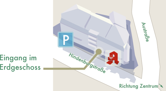 Nehmen Sie den Eingang links neben der Park-Apotheke. Die Anmeldung befindet sich im Erdgeschoss.